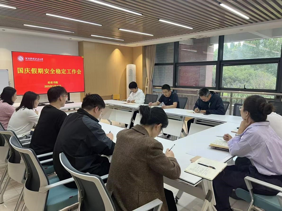 9 月 28 日,书院于怡 2 二楼会议室召开国庆假期安全稳定工作专题会议,统筹部署假期安全工作,切实维护校园安全稳定。书院党委书记冯建栋主持会议,全体教工参加。